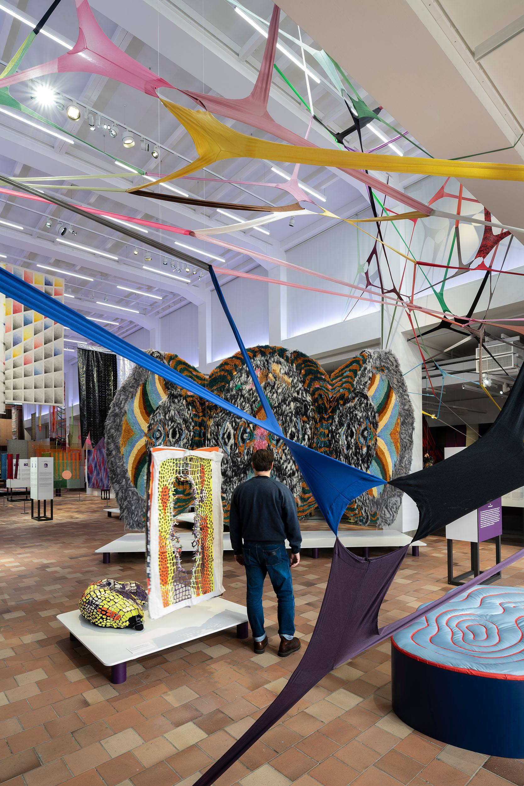 Within the work, familiar binaries collapse. William Morris appears beside children’s bedsheets; silk sits next to cheap synthetics. Once discarded, these materials share the same fate—value flattened in death, hierarchy dissolved. Yet in her hands, they return with new life, pushed into forms never intended for them. Lanz’s desire to twist textiles into unexpected directions moves beyond fashion and utility, challenging the narratives imposed on these materials during their first lives.