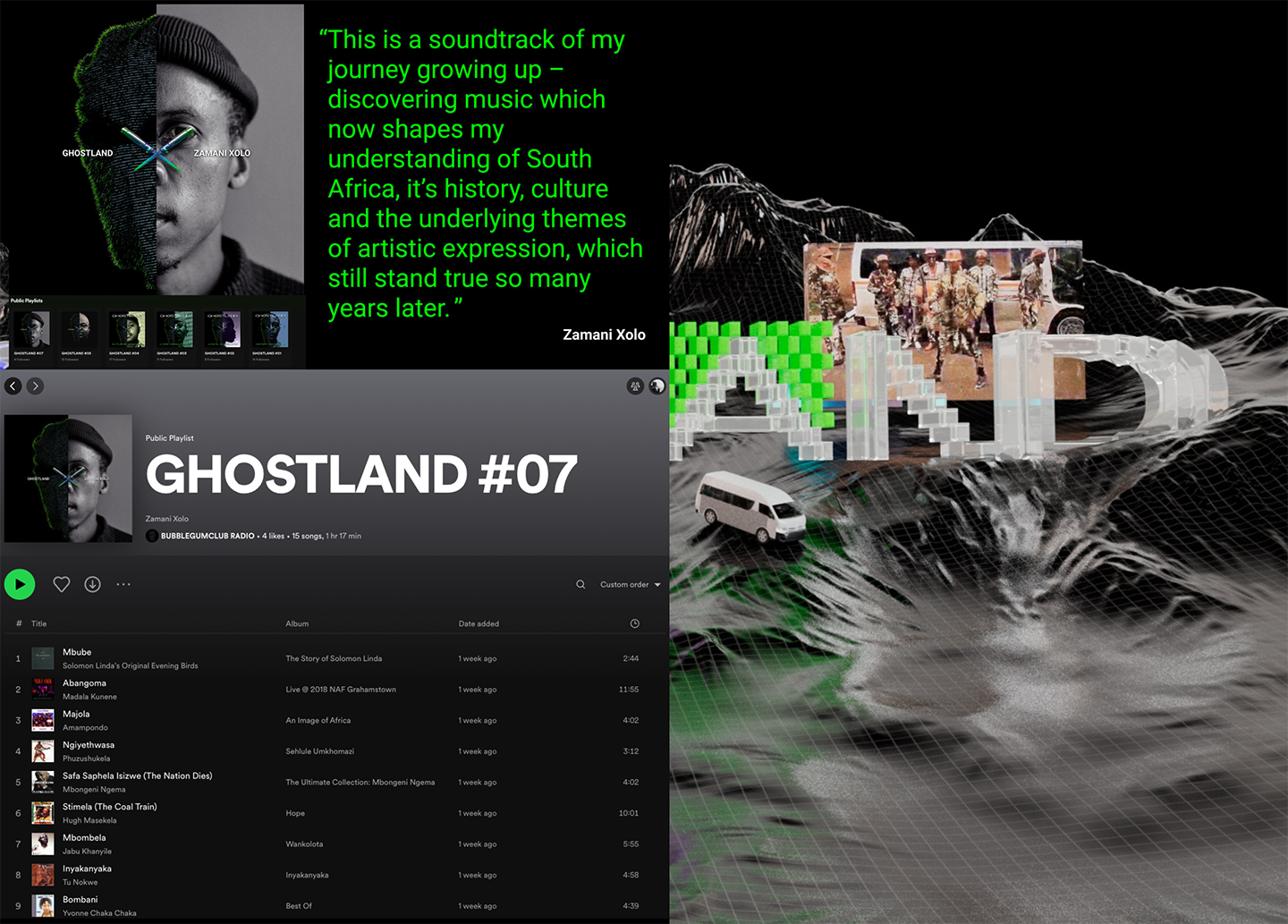 Ghostland is a digital space that delves into the depths of South Africa’s vibrant sonic heritage, merging music, history, and socio-political narratives. Through DJ sets, curated mixtapes, and interviews, this project transports audiences into an immersive space where traditional South African sounds converge with innovative digital expressions. More than a musical journey, Ghostland serves as a reflection on grief, hope, and the radical possibilities of Black futures. By showcasing dynamic collaborations between South African producers and dancers, it redefines the future of music publishing, celebrating the cultural richness and transformative power of sound.